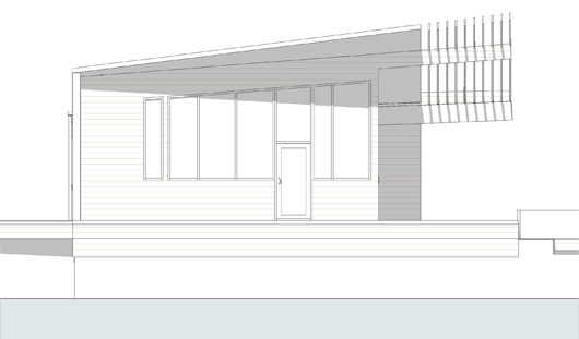 Byggnaden nås via ett trädäck med belysning och ett antal sittplatser. Trädäcket sammankopplar receptionsbyggnaden med gästhamnens bryggor och med byggnaden för gästhamnsservice. Däcket avslutas österut med gradänger att sitta i, som trappar ner mot vattnet och hamninloppet.
